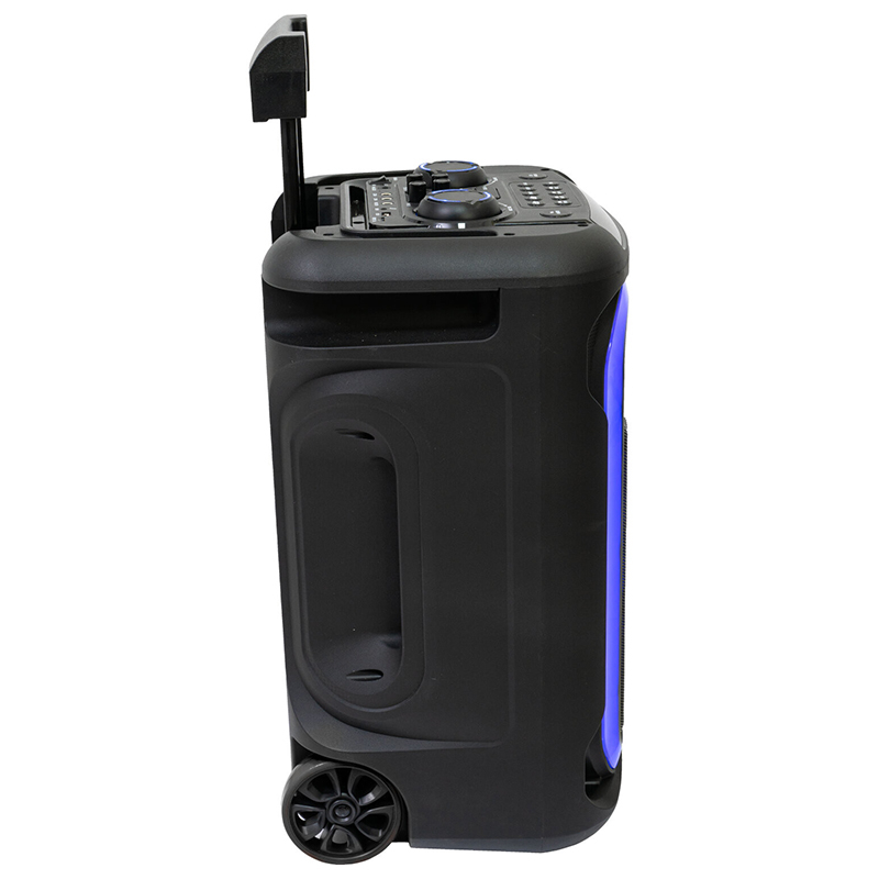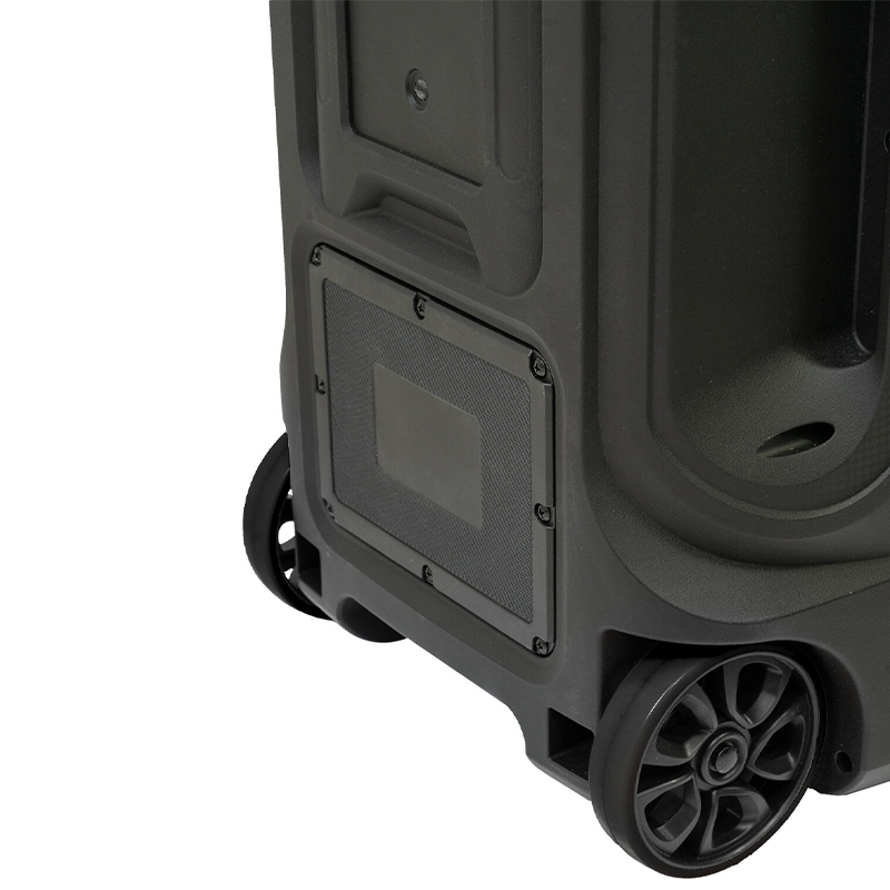 Difuzor mobil cu roți și cărucior, alimentat de o baterie reîncărcabilă. Include un joc de lumini pentru atmosferă. | Dimensiuni: 350 x 300 x 590 mm |