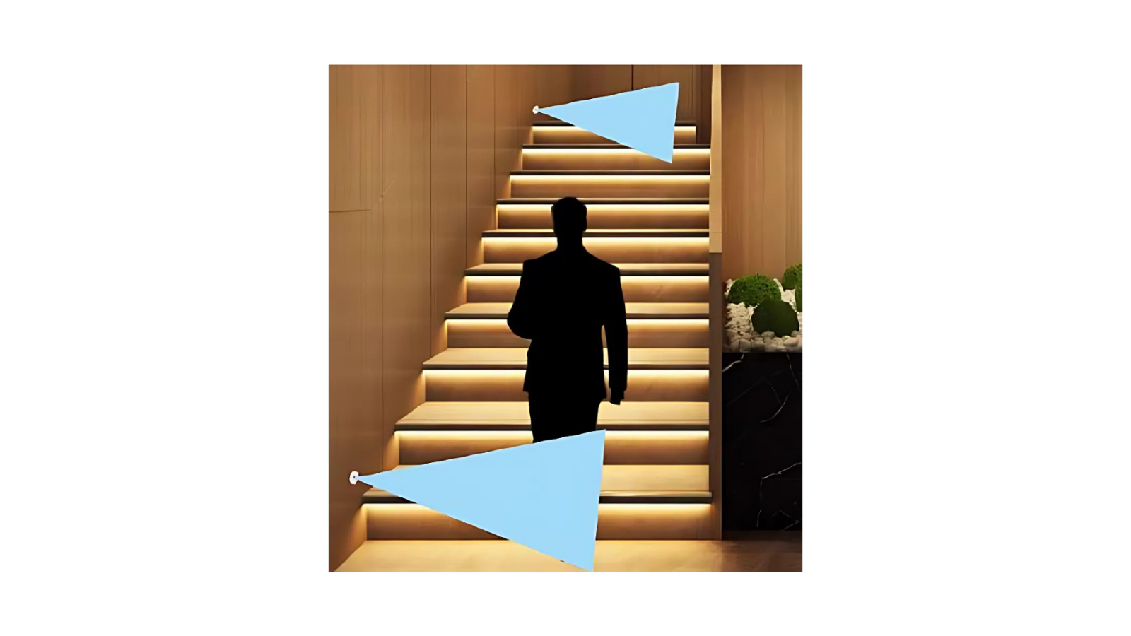 Producătorul recomandă montarea la cel puțin 8 cm de treaptă, de preferință la începutul și sfârșitul scărilor. Este important ca senzorul să nu fie obstrucționat de elementele balustradei și să nu fie expus la lumina directă a soarelui.
