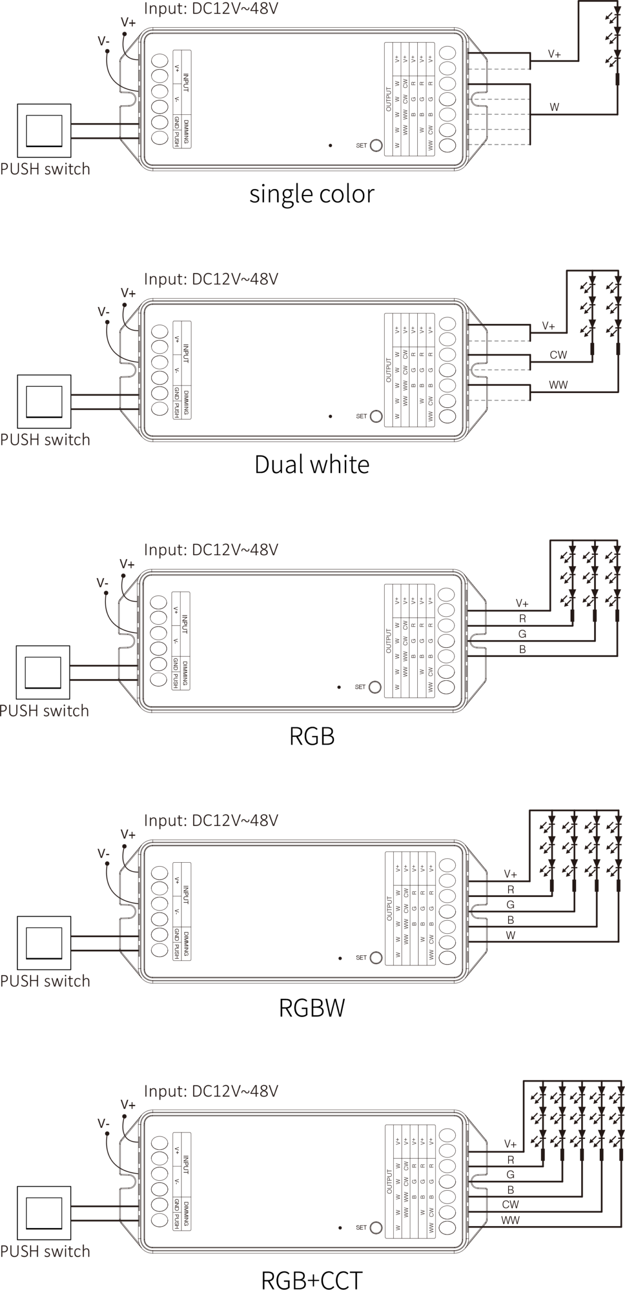 Comutarea a 5 moduri de ieșire printr-un singur buton (Culoare unică / Alb dublu / RGB / RGBW / RGB+CCT)