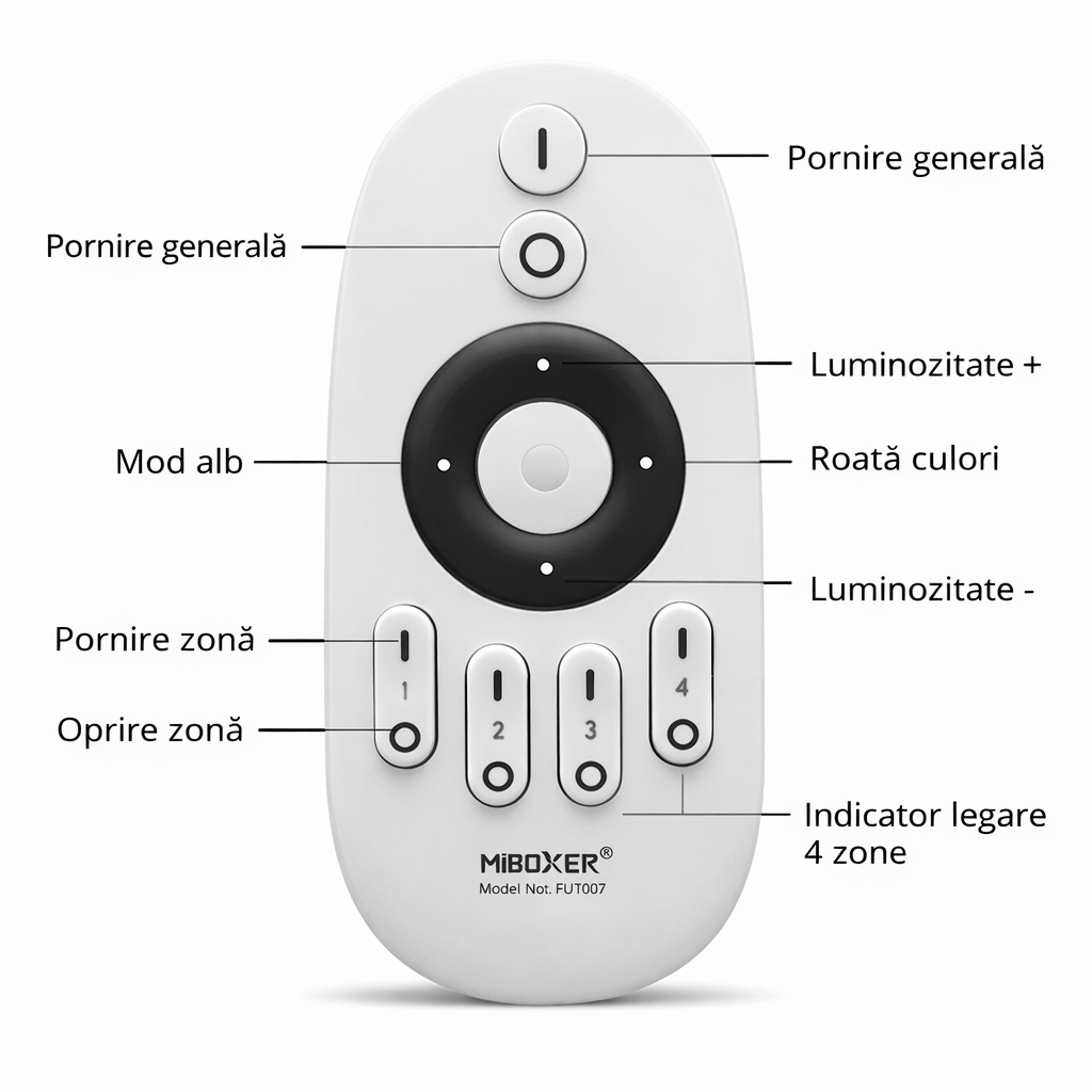 Telecomanda FUT007 este concepută pentru a controla sistemele de iluminat LED din seria FUT035S / FUT036S / FUT038S / FUT039S / WL5.Comunicarea între dispozitive are loc prin intermediul undelor radio în banda de frecvență 2.4 GHz. Telecomanda este echipată cu butoane fizice, permițând controlul independent al aprinderii, luminozității și culorii luminii în până la 4 zone (numai pentru controler și banda luminoasă CCT)..
