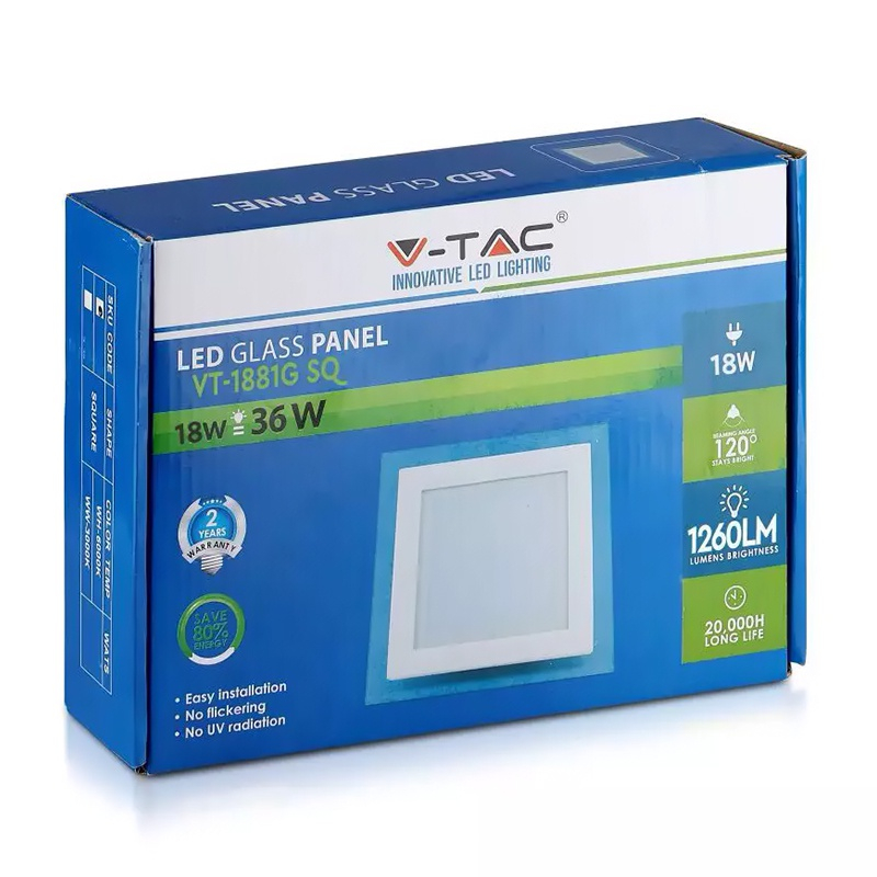 V-TAC PANOU LED PATRAT INCORPORABIL 18W 6400K ALB RECE, STICLA